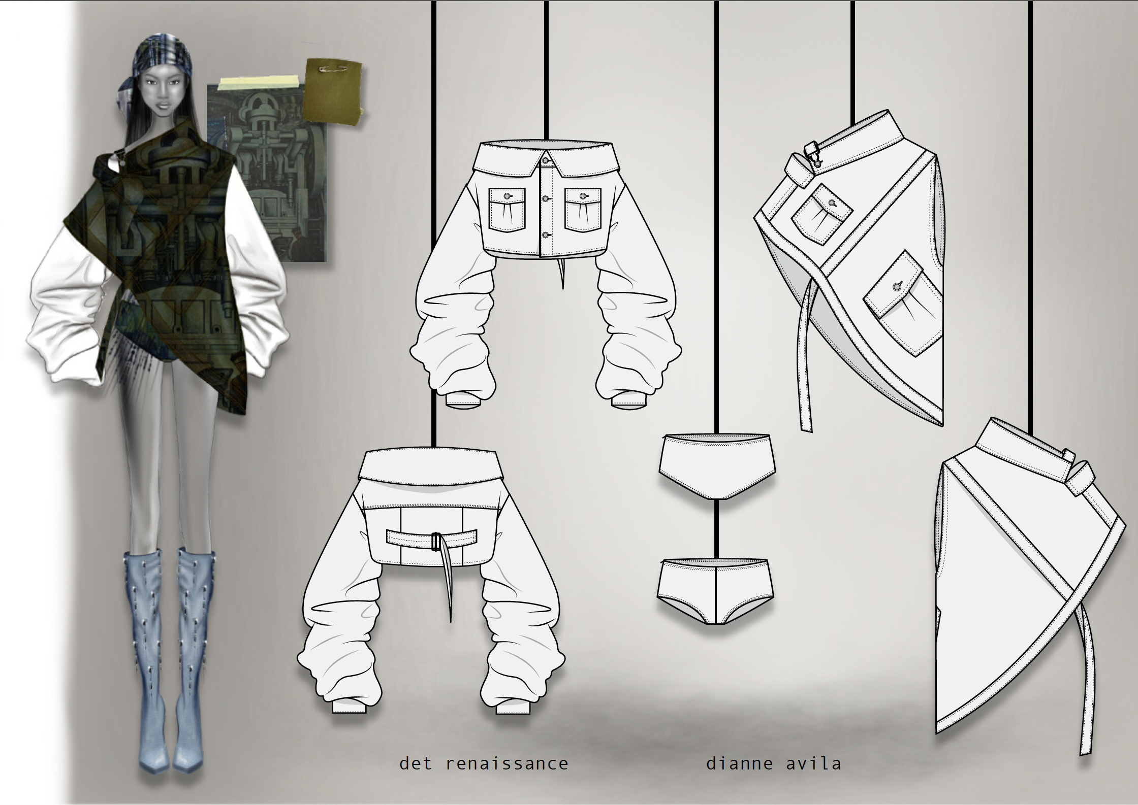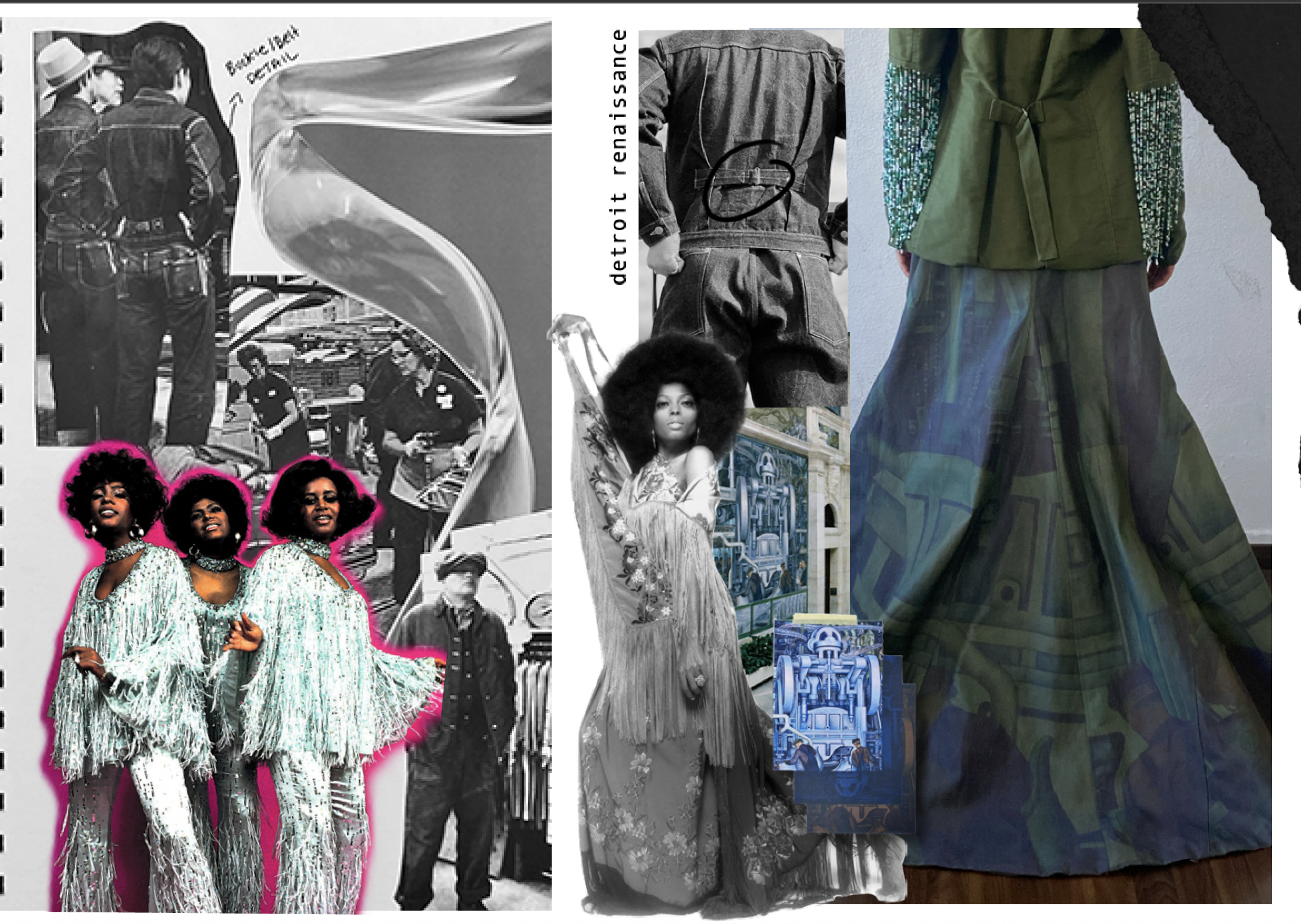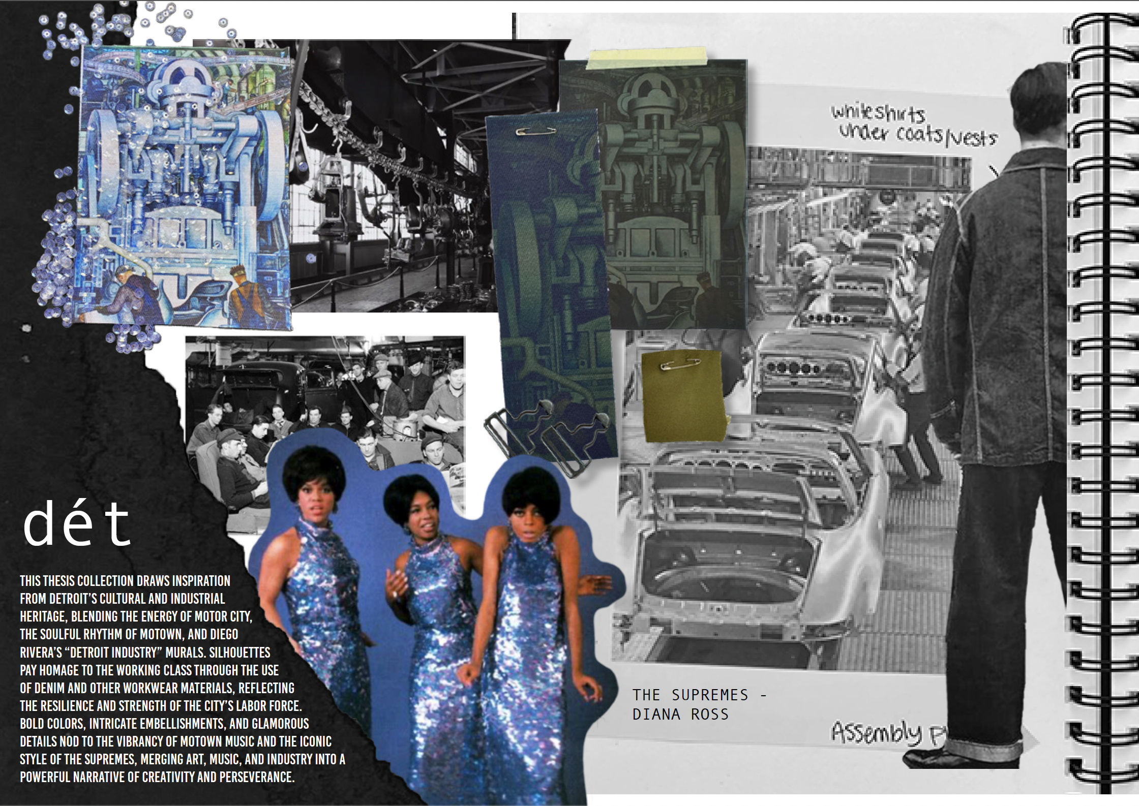 This collection draws inspiration from Detroit’s cultural and industrial heritage, blending the energy of Motor City, the soulful rhythm of Motown, and Diego Rivera’s “Detroit Industry” murals. The Silhouettes pay homage to the working class through the use of denim and other workwear materials, reflecting the resilience and strength of the city’s labor force. Bold colors, intricate embellishments, and glamorous details nod to the vibrancy of Motown music and the iconic style of The Supremes, merging art, music, and industry into a powerful narrative of creativity and perseverance.
